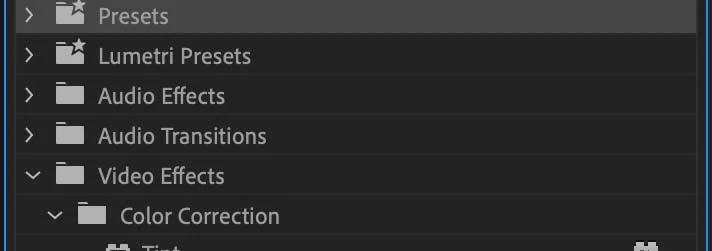 Before you get started, you’ll need an effect ready to go. In this example, we’ll use the built-in ‘Tint’ effect from the Color Correction tab under Video Effects.